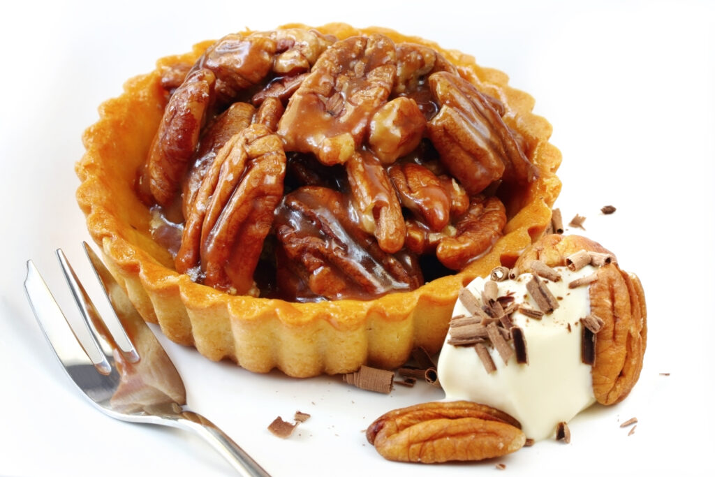 Pecan tart, with cream and shaved chocolate. A delicious nutty dessert.