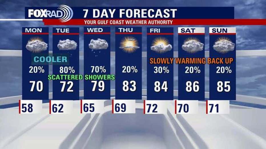 Behind the weekend front, temperatures drop into the 70s with more clouds and a noticeable decrease in humidity.
