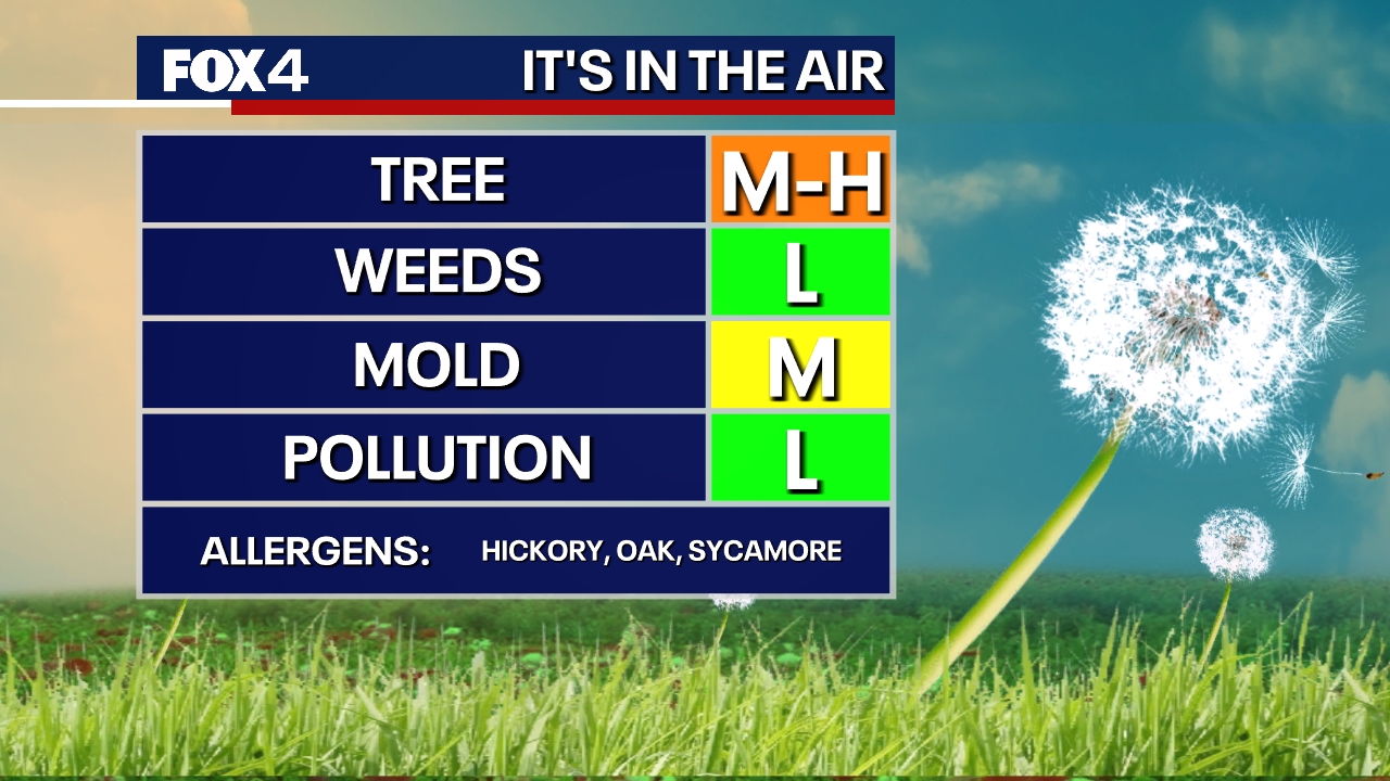 High tree pollen counts are returning to North Texas. Pollen levels will remain high through the first half of the week before a brief dip on Thursday. However, expect counts to surge to very high levels by Sunday. Ragweed and mold levels currently remain moderate.