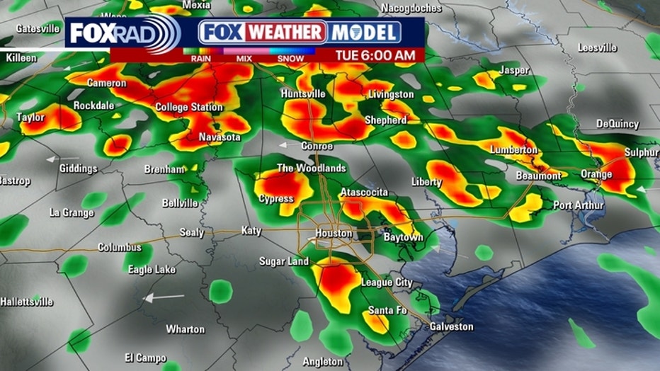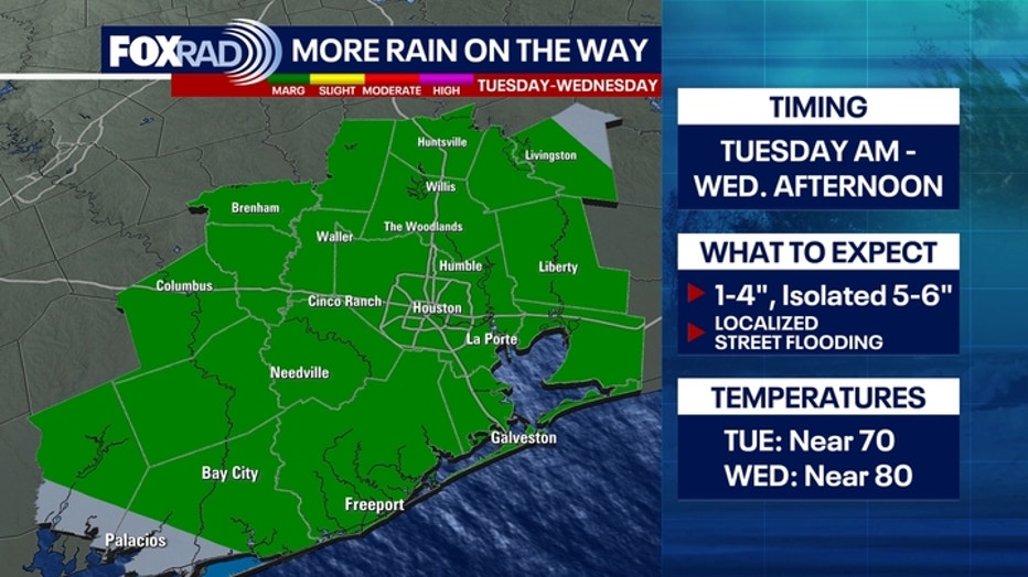 Houston will be under a FOX 26 Storm Alert Tuesday with a threat of 1-3 inches of rain and a few flooded streets.