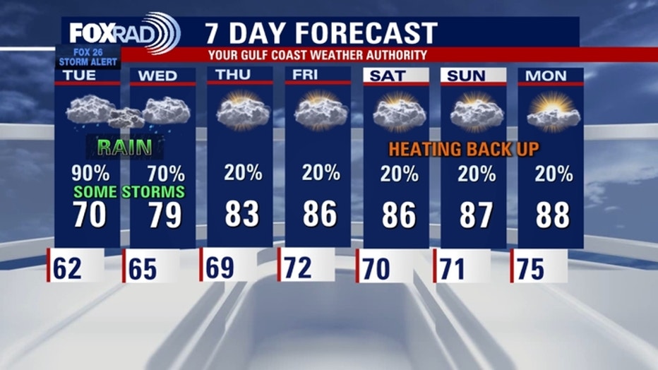 Rain chances increase Tuesday and Wednesday as Gulf moisture returns. Houston will be under a FOX 26 Storm Alert Tuesday with a threat of 1-3 inches of rain and a few flooded streets.
