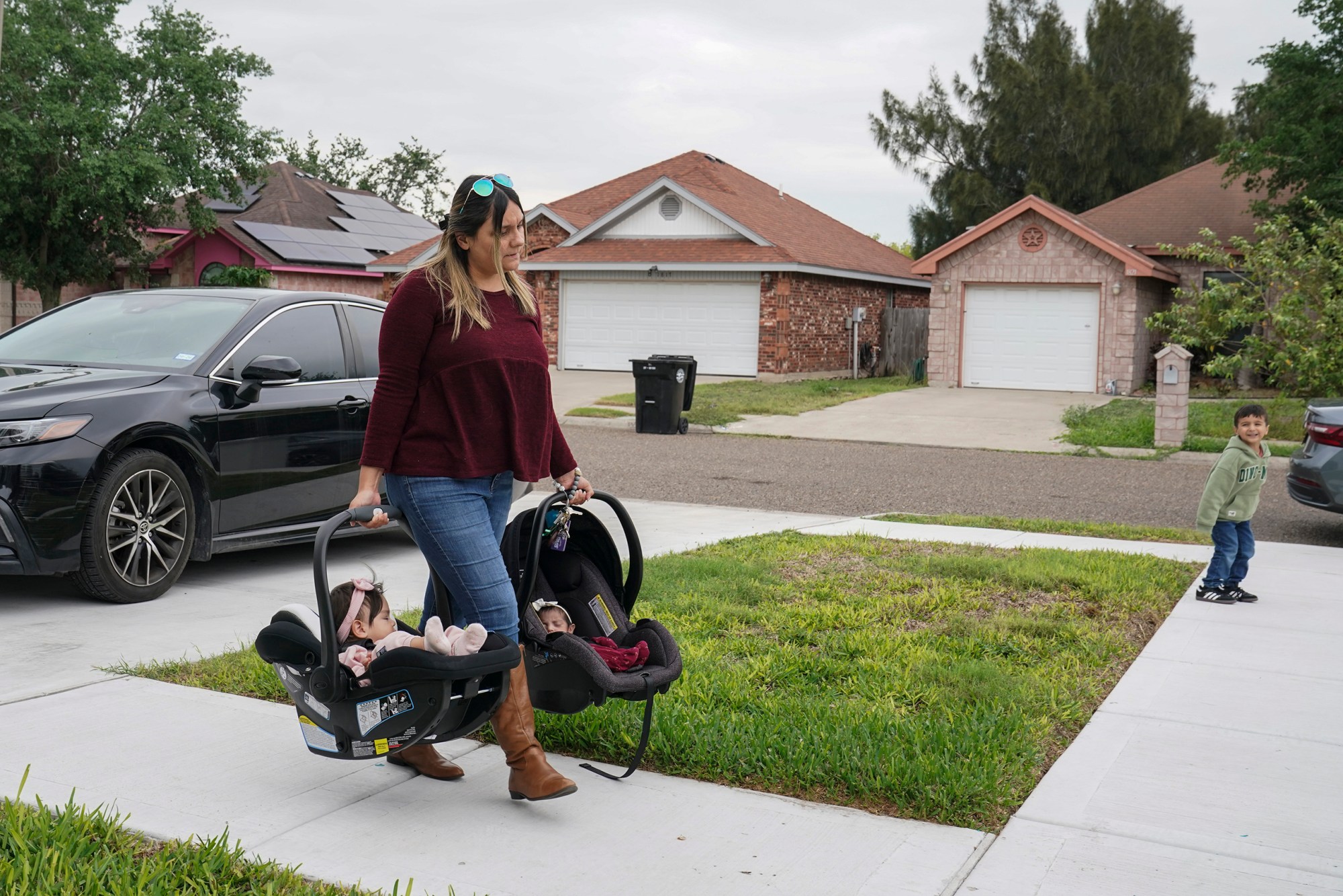 Stephanie Villarreal carries her daughters, who are 10 months and 2 months old, as her 4-year-old son Damien goes to check the mail at their home in Welsaco.