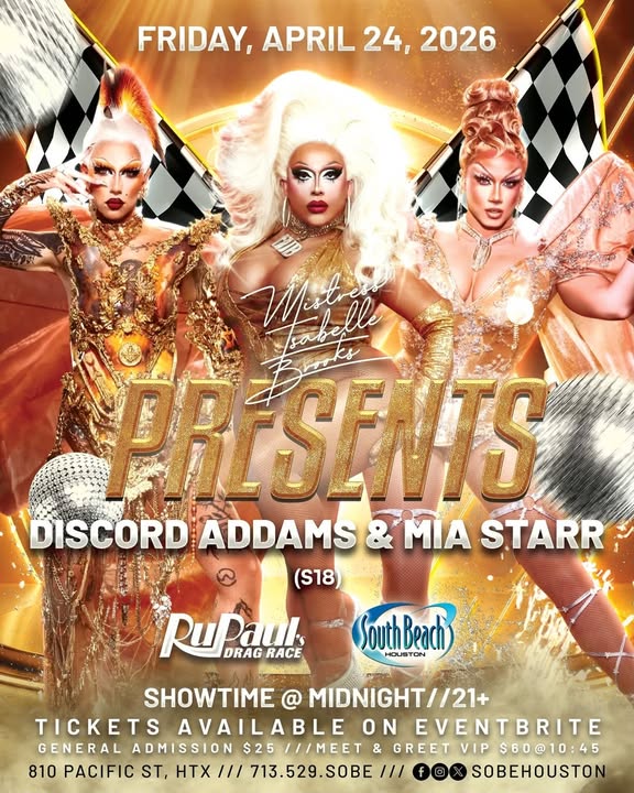 RuPaul’s Drag Race Season 18 superstars Discord Addams and Mia Starr join Mistress Isabelle Brooks at South Beach Houston for an unforgettable night of foolishness, chaos, and entertainment. 810 Pacific St. Midnight.