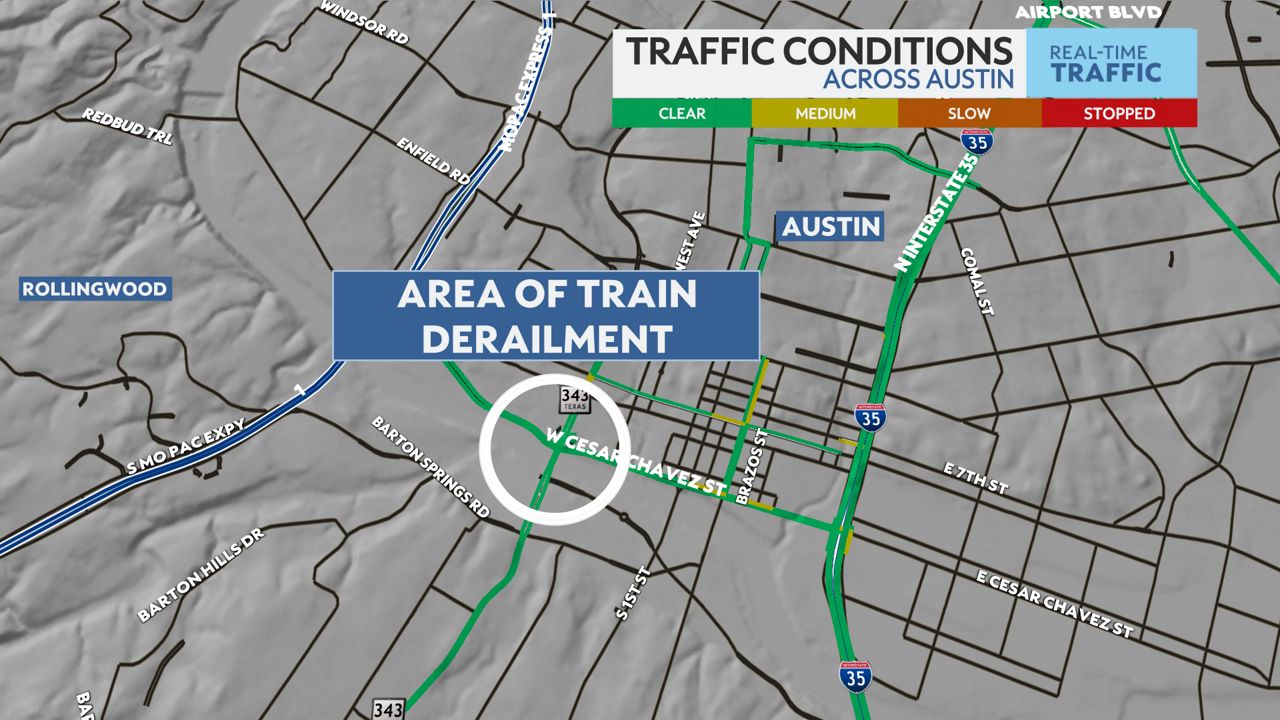 AUSTIN, Texas — A freight train derailed in downtown Austin, causing road closures early Thursday and resulting in no injuries.