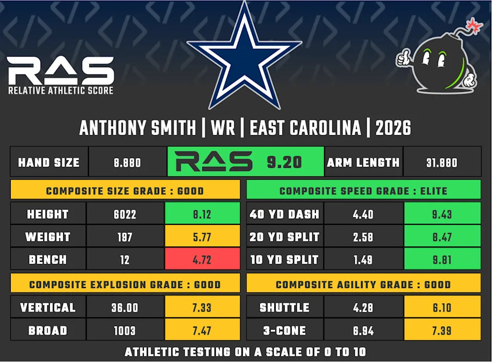 East Carolina wide receiver Anthony Smith found a new home in Arlington, TX as the 218th overall selection by the Dallas Cowboys in the 2026 NFL Draft. Smith was the second pick of the seventh round on Saturday, becoming the second player drafted out of the American Conference.