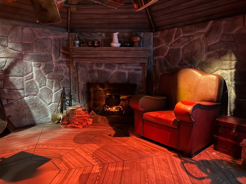 Warm up by the cozy hearth of Hagrid’s Hut with a crackling fireplace and rustic charm.