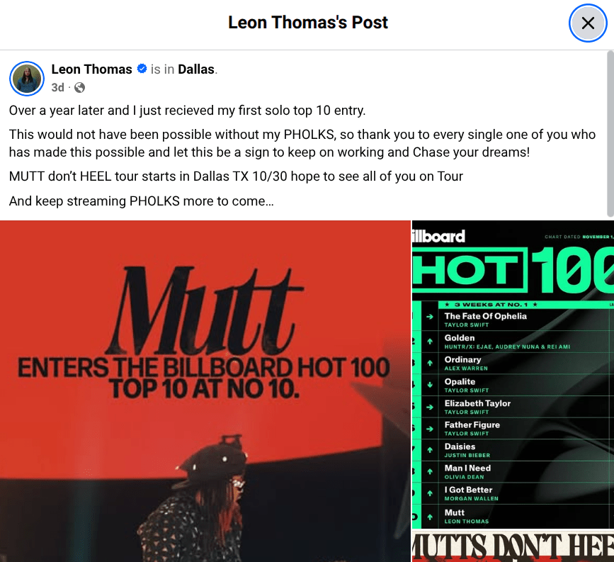 Leon Thomas is thanking his fans for his first solo song reaching the top 10.