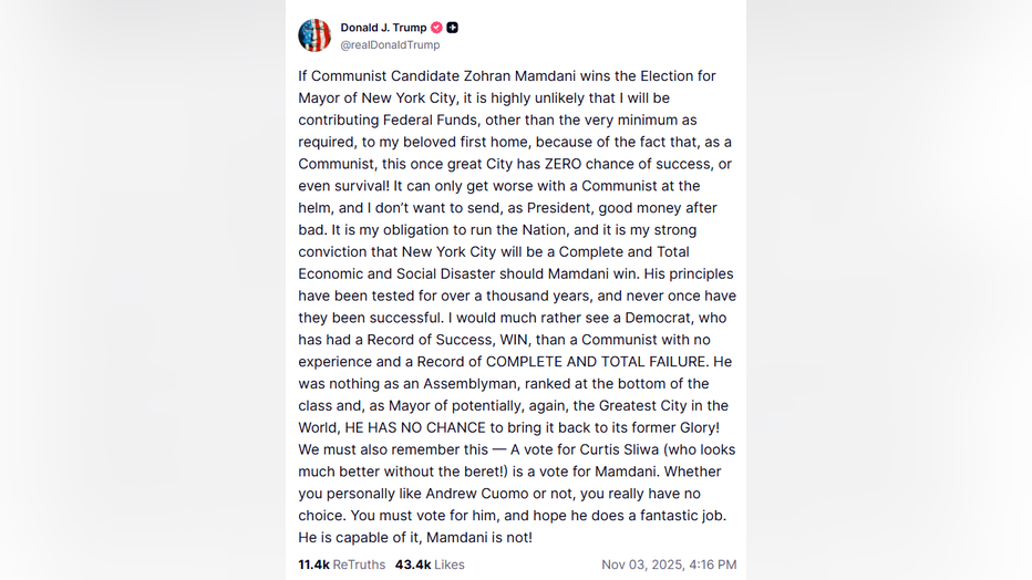 “It is my obligation to run the nation, and it is my strong conviction that New York City will be a complete and total economic and social disaster should Mamdani win,” Trump wrote, adding that Mamdani, a former state assemblyman, was “nothing as an assemblyman.”