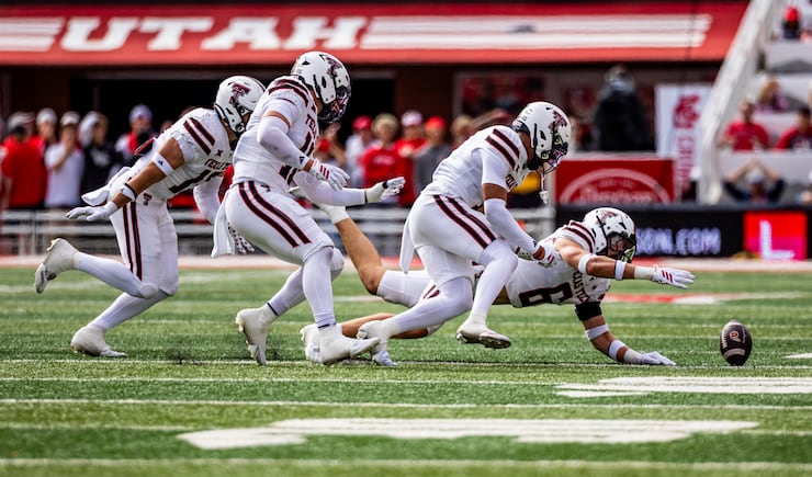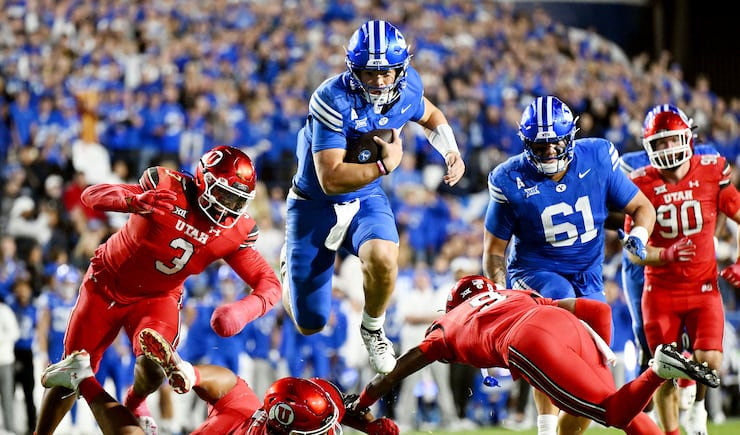 BYU quarterback Bear Bachmeier (47) jumps over Utah defensive tackle Pupu Sepulona (45) and Utah cornerback Elijah Davis (9) during a run into the endzone for a rushing touchdown as BYU and Utah play at LaVell Edwards Stadium in Provo on Saturday, Oct. 18, 2025. | Scott G Winterton, Deseret News BYU running back LJ Martin (4) makes a cut as he runs as BYU and Utah play at LaVell Edwards Stadium in Provo on Saturday, Oct. 18, 2025. | Scott G Winterton, Deseret News BYU defensive tackle Keanu Tanuvasa (57) calls for cheers from the fans as BYU and Utah play at LaVell Edwards Stadium in Provo on Saturday, Oct. 18, 2025. | Scott G Winterton, Deseret News BYU students cheer as BYU and Utah play at LaVell Edwards Stadium in Provo on Saturday, Oct. 18, 2025. | Scott G Winterton, Deseret News Texas Tech quarterback Behren Morton (2) during the first half of an NCAA college football game against Houston, Saturday, Oct. 4, 2025, in Houston. | Karen Warren, Associated Press Texas Tech defensive lineman Ansel Nedore, front right, sacks Oklahoma State quarterback Noah Walters, left, during the second half of an NCAA college football game, Saturday, Oct. 25, 2025, in Lubbock, Texas. | Chase Seabolt, Associated Press Texas Tech Red Raiders head coach Joey McGuire stands on the sideline during an NCAA football game between the University of Utah Utes and the Texas Tech University Red Raiders held at Rice-Eccles Stadium in Salt Lake City on Saturday, Sept. 20, 2025. | Tess Crowley, Deseret News Texas Tech Red Raiders recover a fumble during an NCAA football game against the University of Utah Utes held at Rice-Eccles Stadium in Salt Lake City on Saturday, Sept. 20, 2025. | Tess Crowley, Deseret News BYU head coach Kalani Sitake reacts after a BYU interception against Iowa State during the first half of an NCAA college football game, Saturday, Oct. 25, 2025, in Ames, Iowa. | AP