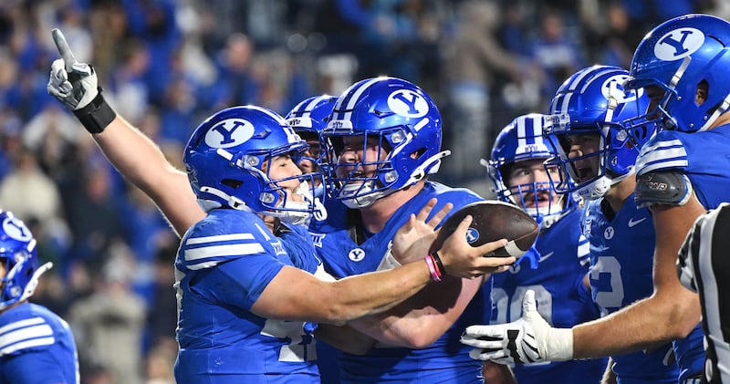 BYU quarterback Bear Bachmeier (47) is swarmed by teammates after scoring a rushing touchdown as BYU and Utah play at LaVell Edwards Stadium in Provo on Saturday, Oct. 18, 2025. | Scott G Winterton, Deseret News