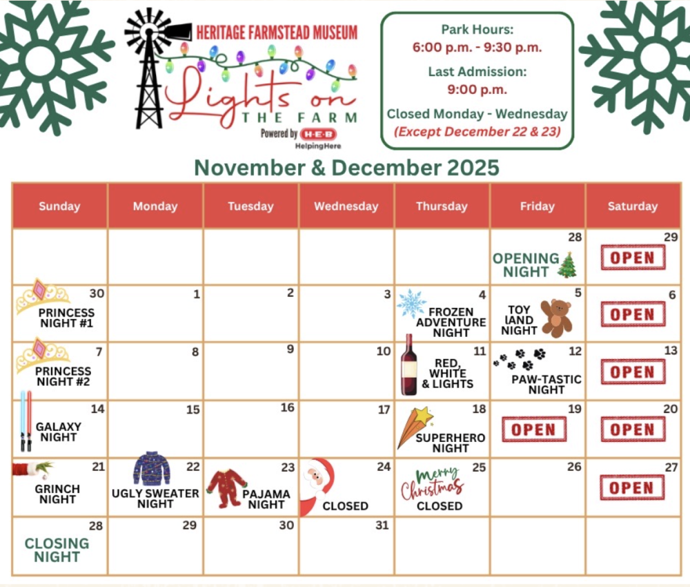 “We’re excited to welcome guests back for our fifth annual Lights on the Farm,” President and CEO M’Lou Hyttinen said. “It has become a special tradition in Plano. Families come from multiple states and countries to celebrate with us.”
