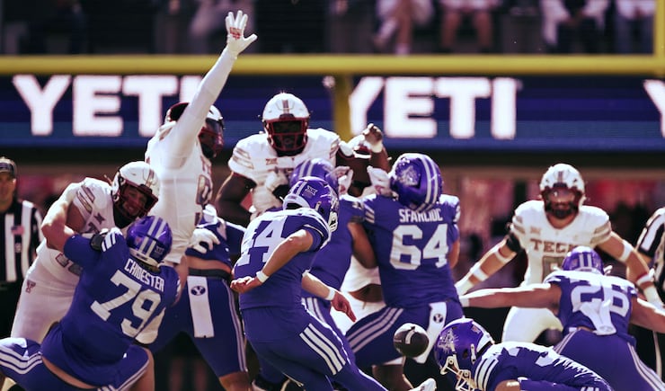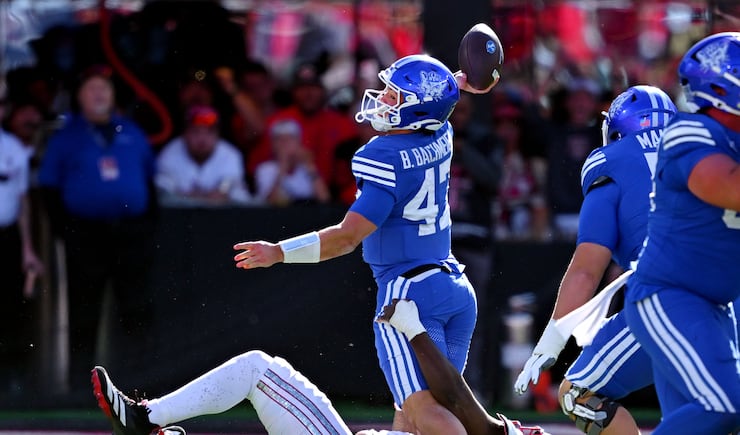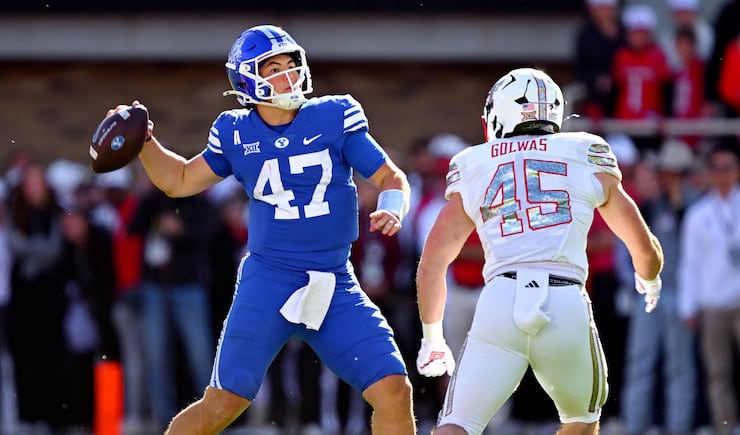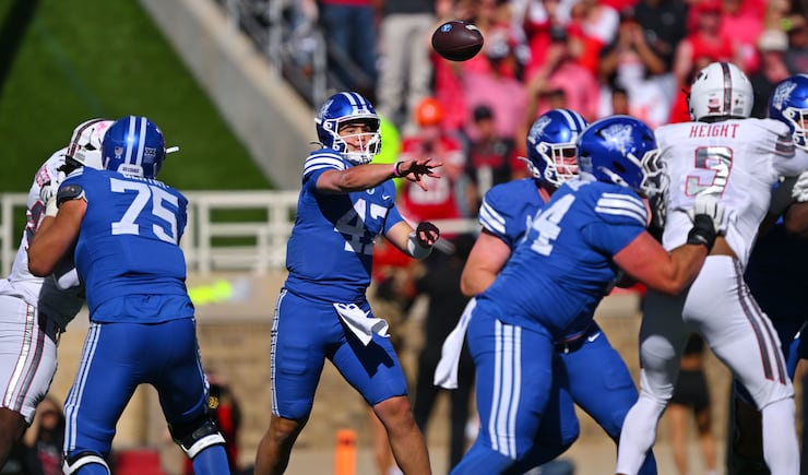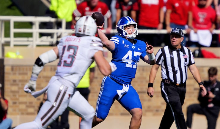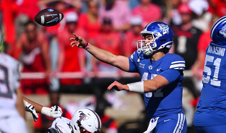 BYU Cougars quarterback Bear Bachmeier (47) is sacked by Texas Tech Red Raiders defensive tackle Lee Hunter (2) and is flagged for a backward pass BYU and Texas Tech play at Jones AT&T Stadium in Lubbock Texas on Saturday, Nov. 8, 2025. | Scott G Winterton, Deseret News BYU Cougars quarterback Bear Bachmeier (47) throws a pass with Texas Tech Red Raiders linebacker David Bailey (31) defending as BYU and Texas Tech play at Jones AT&T Stadium in Lubbock Texas on Saturday, Nov. 8, 2025. | Scott G Winterton, Deseret News BYU Cougars wide receiver Parker Kingston (11) is hit hard by Texas Tech Red Raiders defensive back Dontae Balfour (20) and the ball falls to turf as BYU and Texas Tech play at Jones AT&T Stadium in Lubbock Texas on Saturday, Nov. 8, 2025. | Scott G Winterton, Deseret News A Cougar fan reacts during the game as BYU and Texas Tech play at Jones AT&T Stadium in Lubbock Texas on Saturday, Nov. 8, 2025. | Scott G Winterton, Deseret News Looking very angry BYU Cougars cornerback Jayden Dunlap (29) and BYU Cougars defensive end Kinilau Fonohema (97) walk off the field after BYU lost to Texas Tech at Jones AT&T Stadium in Lubbock Texas on Saturday, Nov. 8, 2025. | Scott G Winterton, Deseret News Texas Tech Red Raiders linebacker Ben Roberts (13) shadows BYU Cougars quarterback Bear Bachmeier (47) as they play at Jones AT&T Stadium in Lubbock Texas on Saturday, Nov. 8, 2025. | Scott G Winterton, Deseret News BYU Cougars quarterback Bear Bachmeier (47) tries to hurdle Texas Tech Red Raiders safety Cole Wisniewski (5) and is driven into the turf as they play at Jones AT&T Stadium in Lubbock Texas on Saturday, Nov. 8, 2025. | Scott G Winterton, Deseret News BYU Cougars head coach Kalani Sitake tries to talk to an official as BYU and Texas Tech play at Jones AT&T Stadium in Lubbock Texas on Saturday, Nov. 8, 2025. | Scott G Winterton, Deseret News The Red Raiders run onto the field prior to playing BYU at Jones AT&T Stadium in Lubbock Texas on Saturday, Nov. 8, 2025. | Scott G Winterton, Deseret News BYU Cougars kicker Will Ferrin (44) misses a field goal attempt as BYU and Texas Tech play at Jones AT&T Stadium in Lubbock Texas on Saturday, Nov. 8, 2025. | Scott G Winterton, Deseret News The crew begins disassembling the GameDay set as BYU and Texas Tech play at Jones AT&T Stadium in Lubbock Texas on Saturday, Nov. 8, 2025. | Scott G Winterton, Deseret News BYU Cougars defensive back Evan Johnson (0) steps to the line as BYU and Texas Tech play at Jones AT&T Stadium in Lubbock Texas on Saturday, Nov. 8, 2025. | Scott G Winterton, Deseret News BYU Cougars head coach Kalani Sitake tries to talk to an official as BYU and Texas Tech play at Jones AT&T Stadium in Lubbock Texas on Saturday, Nov. 8, 2025. | Scott G Winterton, Deseret News BYU Cougars quarterback Bear Bachmeier (47) tries to hurdle Texas Tech Red Raiders safety Cole Wisniewski (5) and is driven into the turf as they play at Jones AT&T Stadium in Lubbock Texas on Saturday, Nov. 8, 2025. | Scott G Winterton, Deseret News Texas Tech Red Raiders linebacker Ben Roberts (13) shadows BYU Cougars quarterback Bear Bachmeier (47) as they play at Jones AT&T Stadium in Lubbock Texas on Saturday, Nov. 8, 2025. | Scott G Winterton, Deseret News Looking very angry BYU Cougars cornerback Jayden Dunlap (29) and BYU Cougars defensive end Kinilau Fonohema (97) walk off the field after BYU lost to Texas Tech at Jones AT&T Stadium in Lubbock Texas on Saturday, Nov. 8, 2025. | Scott G Winterton, Deseret News A Cougar fan reacts during the game as BYU and Texas Tech play at Jones AT&T Stadium in Lubbock Texas on Saturday, Nov. 8, 2025. | Scott G Winterton, Deseret News BYU Cougars wide receiver Parker Kingston (11) is hit hard by Texas Tech Red Raiders defensive back Dontae Balfour (20) and the ball falls to turf as BYU and Texas Tech play at Jones AT&T Stadium in Lubbock Texas on Saturday, Nov. 8, 2025. | Scott G Winterton, Deseret News BYU Cougars quarterback Bear Bachmeier (47) throws a pass with Texas Tech Red Raiders linebacker David Bailey (31) defending as BYU and Texas Tech play at Jones AT&T Stadium in Lubbock Texas on Saturday, Nov. 8, 2025. | Scott G Winterton, Deseret News BYU Cougars quarterback Bear Bachmeier (47) is sacked by Texas Tech Red Raiders defensive tackle Lee Hunter (2) and is flagged for a backward pass BYU and Texas Tech play at Jones AT&T Stadium in Lubbock Texas on Saturday, Nov. 8, 2025. | Scott G Winterton, Deseret News Dejected BYU players and staff watch the replay of a penalty as they and Texas Tech play at Jones AT&T Stadium in Lubbock Texas on Saturday, Nov. 8, 2025. | Scott G Winterton, Deseret News BYU Cougars head coach Kalani Sitake points out toward the field as BYU and Texas Tech play at Jones AT&T Stadium in Lubbock Texas on Saturday, Nov. 8, 2025. | Scott G Winterton, Deseret News BYU Cougars defensive lineman Tausili Akana (13) tries to deflect a pass to Texas Tech Red Raiders wide receiver Micah Hudson (14) BYU and Texas Tech play at Jones AT&T Stadium in Lubbock Texas on Saturday, Nov. 8, 2025. | Scott G Winterton, Deseret News BYU Cougars quarterback Bear Bachmeier (47) throws a pass past Texas Tech Red Raiders defensive lineman Charles Esters III (11) as BYU and Texas Tech play at Jones AT&T Stadium in Lubbock Texas on Saturday, Nov. 8, 2025. | Scott G Winterton, Deseret News BYU Cougars wide receiver Chase Roberts (2) BYU watches the ball into his hands as they and Texas Tech play at Jones AT&T Stadium in Lubbock Texas on Saturday, Nov. 8, 2025. | Scott G Winterton, Deseret News BYU Cougars tight end Carsen Ryan (20) sheds Texas Tech Red Raiders defensive back AJ McCarty (1) off as BYU and Texas Tech play at Jones AT&T Stadium in Lubbock Texas on Saturday, Nov. 8, 2025. | Scott G Winterton, Deseret News BYU Cougars quarterback Bear Bachmeier (47) goes for a pass over Texas Tech Red Raiders linebacker Brock Golwas (45) as BYU and Texas Tech play at Jones AT&T Stadium in Lubbock Texas on Saturday, Nov. 