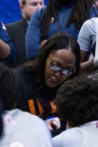Head coach Shereka Wright speaks to her team during halftime in a game against the University of Wyoming on Nov. 11 at College Park Center. Wright was hired as head coach in 2020.