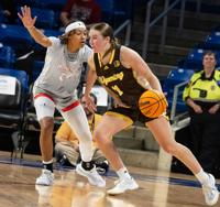 Junior forward Miraya Perkins, left, guards Madi Symons, University of Wyoming junior forward, in a game Nov. 11 at College Park Center. Perkins scored four points.