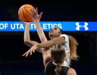 Freshman forward Kira Reynolds attempts a layup, guarded by a University of Wyoming defender Nov. 11 at College Park Center. Reynolds scored 14 points.