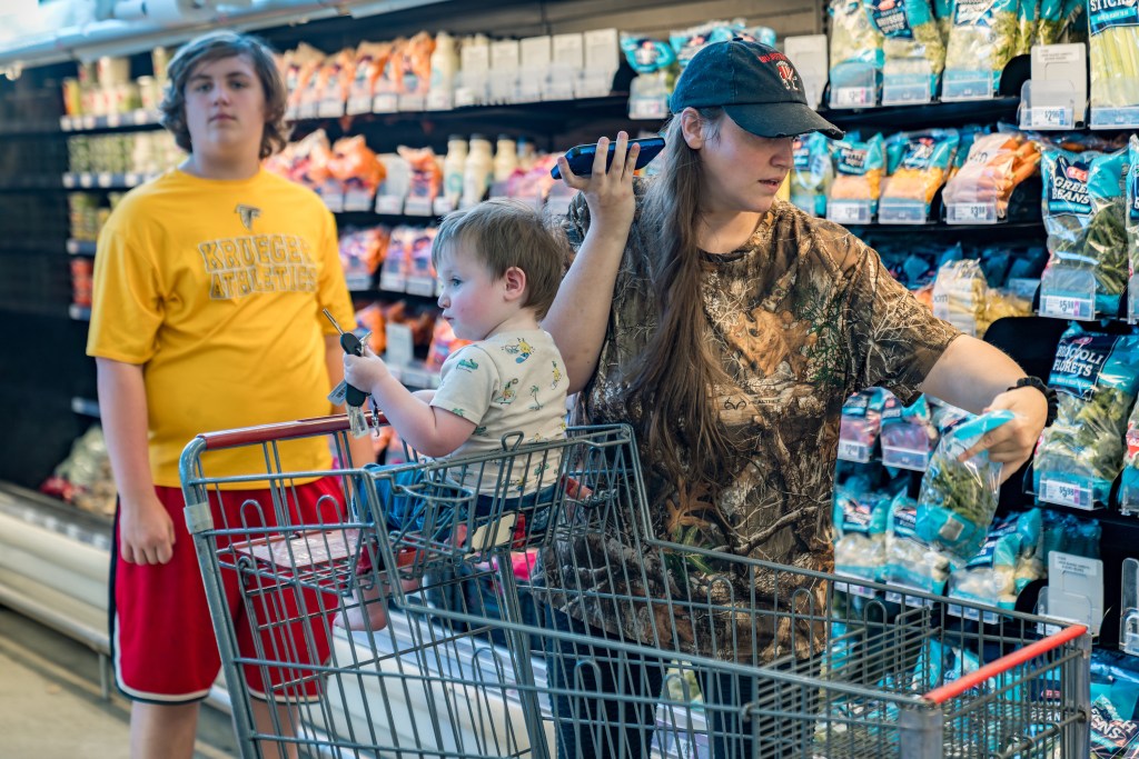 Pomeroy shops for groceries with her 12-year-old son, Michael Jaskinia, and 18-month-old son, Levi Pomeroy, at an H-E-B store in Austin on Nov. 7. Eric Vryn for The Texas Tribune