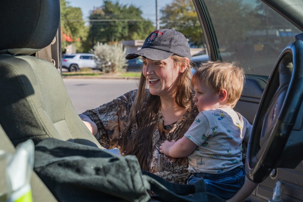 Kelley Anne Pomeroy loads her 18-month-old son Levi into a vehicle after picking him up from the Seguin Head Start Center on Nov. 7. Eric Vryn for The Texas Tribune