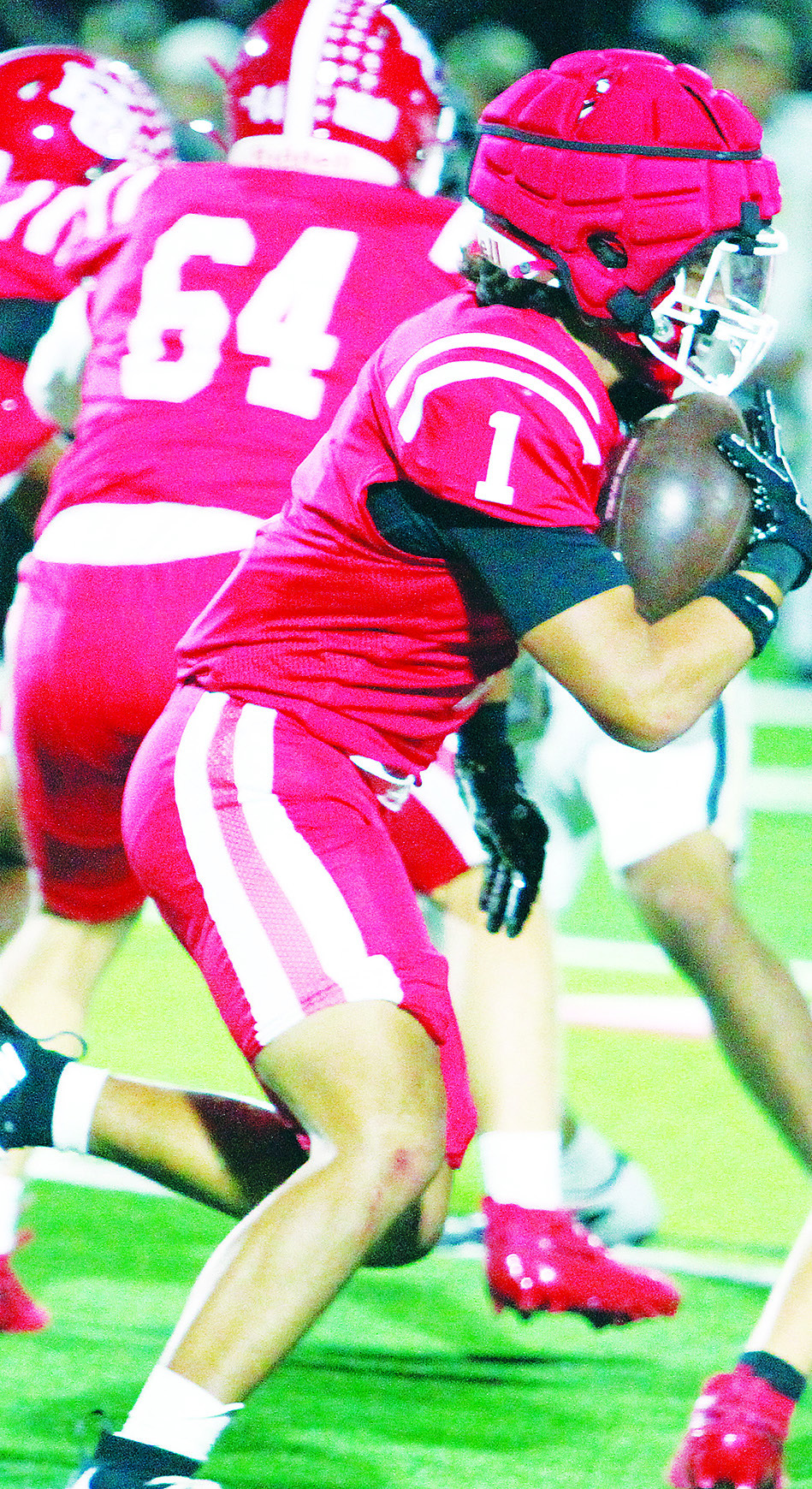 RUSHING LEADER: El Campo junior runningback Vlad Garcia (1) heads into the playoffs having rushed for 1,201 yards on the season with 16 touchdowns. He has also caught six passes for 125 yards and two scores. As a team, the Ricebirds are averaging 329.9 yards per game with 252.8 yards per game coming on the ground. L-J Photo by Michael S. McCracken