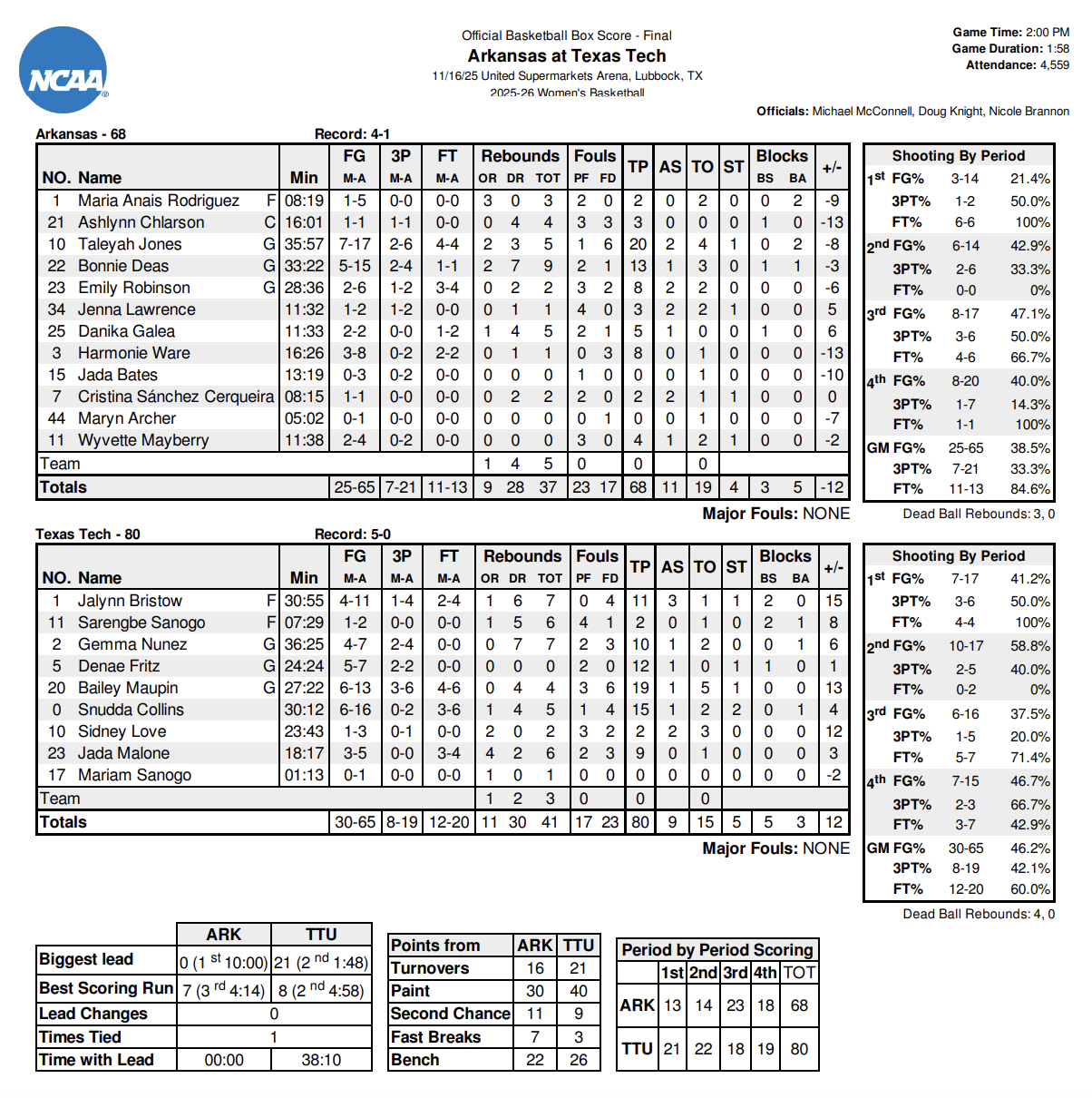 Texas Tech won the rebounding battle 41-37 and the turnover battle 19-15. The Lady Raiders scored 21 points off the Razorbacks’ giveaways.
