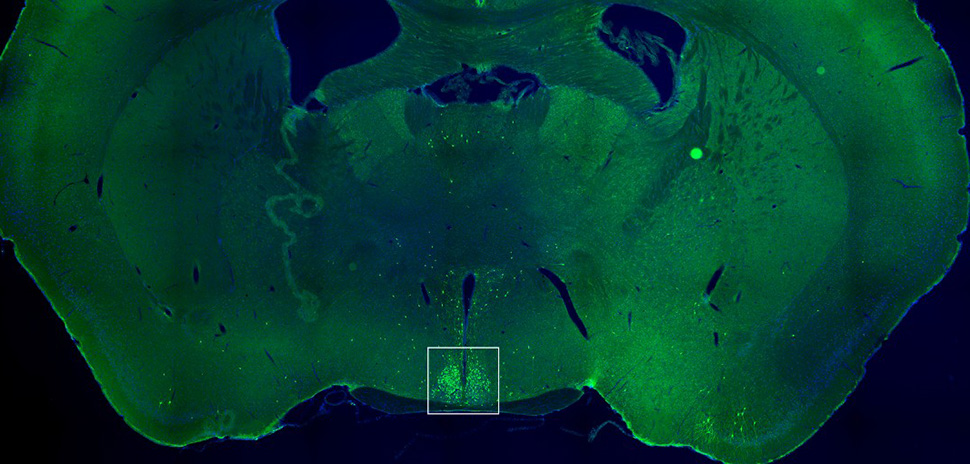 In this slice of a mouse brain, the white box highlights the suprachiasmatic nucleus—the brain’s internal clock. The green dots mark neurons that respond to the hunger hormone ghrelin. [Image: UTSW]