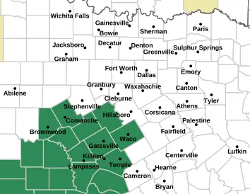 According to the NWS, Bandera, Bexar, Bell, Blanco, Brown, Burnet, Bosque, Comal, Comanche, Coryell, Edwards, Hamilton, Gillespie, Hays, Kendall, Kimble, Kerr, Kinney, Llano, Lampasas, Mason, Medina, McLennan, McCulloch, Menard, Mills, Real, San Saba, Sutton, Travis, Uvalde, Val Verde and Williamson counties are facing the watch starting overnight.