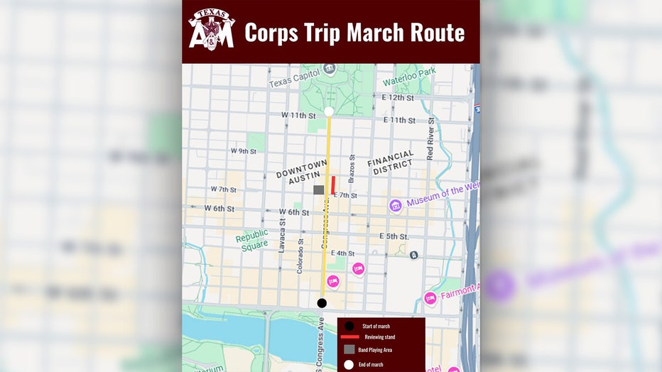 The Texas A&M Corps of Cadets will march down South Congress Avenue beginning at 1 p.m.Â