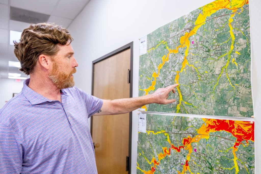 Evers points to a map showing the areas that were inundated during a 2016 flood. Michael Cavazos for The Texas Tribune and ProPublica