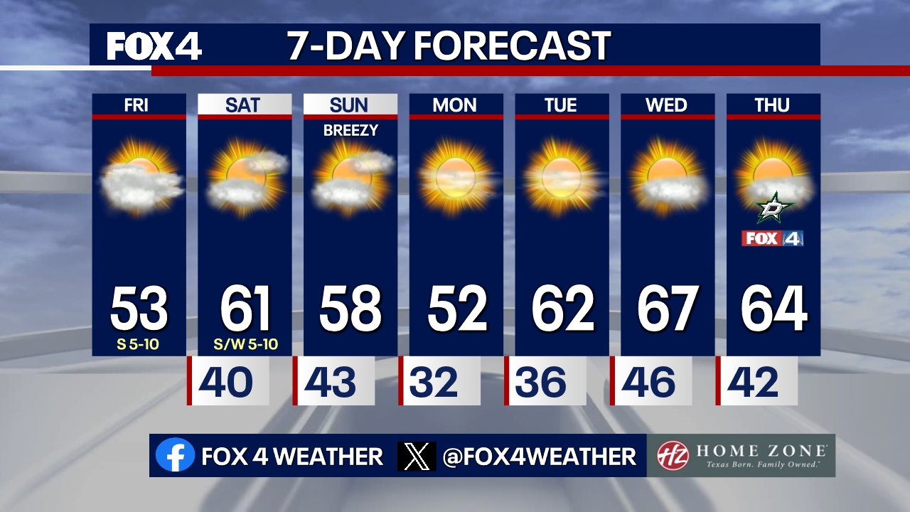After Thursday’s well-below-average temperatures, DFW will see a slight warm-up this weekend, ushering in seasonally mild conditions.