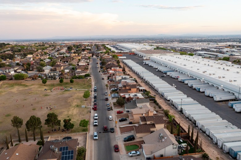 Seen are the homes and park directly behind a Cardinal Health warehouse on Monday, April 14, 2025, in El Paso, Texas. Photo by Ivan Pierre Aguirre for Grist