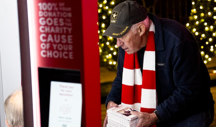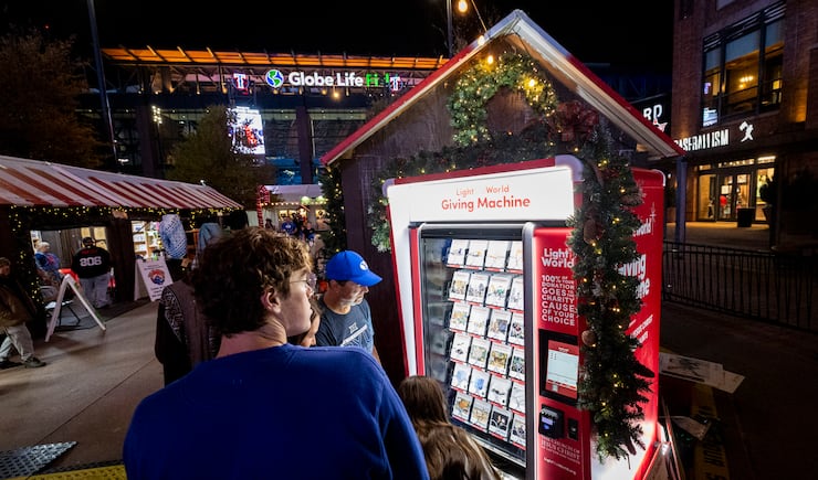 Gerald Kokoenes helps restock a Giving Machine during pregame festivities for BYU fans held the day before the Big 12 championship game at Globe Life Field in Arlington, Texas, on Friday, Dec. 5, 2025. | Isaac Hale, Deseret News
