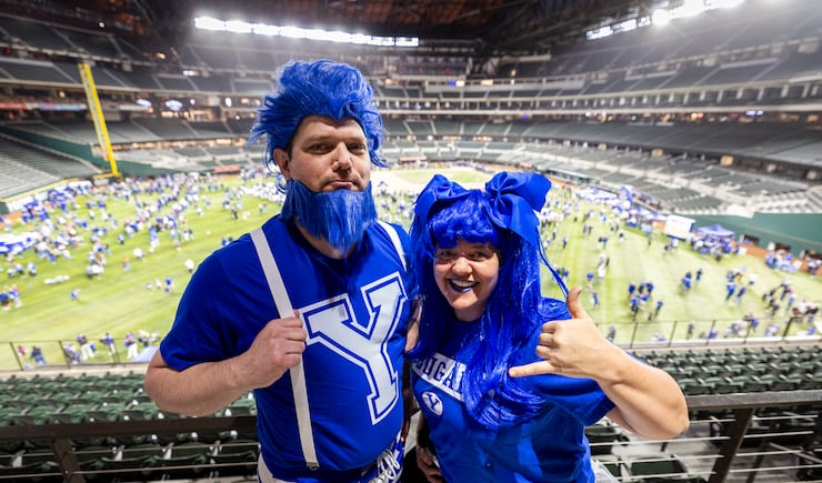 Jared T., of Boise, Idaho, and Amy C., of Alpine, pose for a photo during pregame festivities for BYU fans held the day before the Big 12 championship game at Globe Life Field in Arlington, Texas, on Friday, Dec. 5, 2025. | Isaac Hale, Deseret News