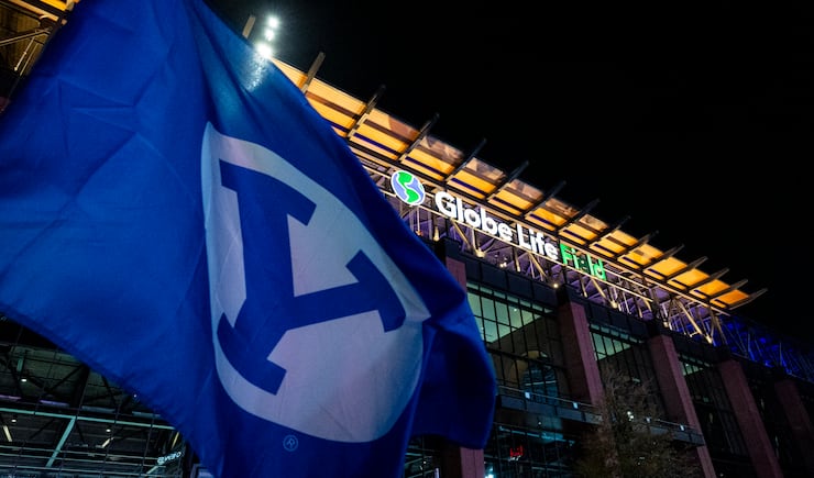 A BYU flag flies in front of Globe Life Stadium during pregame festivities for BYU fans held the day before the Big 12 championship game in Arlington, Texas, on Friday, Dec. 5, 2025. | Isaac Hale, Deseret News