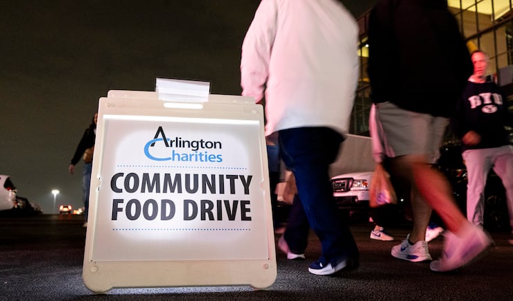 People pass by a sign as part of a food drive with Arlington Charities during pregame festivities for BYU fans held the day before the Big 12 championship game at Globe Life Field in Arlington, Texas, on Friday, Dec. 5, 2025. | Isaac Hale, Deseret News