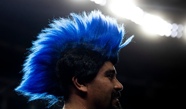 Salvador Garcia, of West Jordan, sports a blue mohawk during pregame festivities for BYU fans held the day before the Big 12 championship game at Globe Life Field in Arlington, Texas, on Friday, Dec. 5, 2025. | Isaac Hale, Deseret News