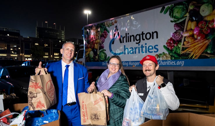 From left, Taggart Barron, chapter chair of the Texas – Dallas/Forth Worth BYU Alumni Chapter, Heather Lowe, development director of Arlington Charities, and Zach Hall, chapter president of the Dallas County Texas Tech Alumni Chapter, pose together for a photo as part of a food drive with Arlington Charities during pregame festivities for BYU fans held the day before the Big 12 championship game at Globe Life Field in Arlington, Texas, on Friday, Dec. 5, 2025. | Isaac Hale, Deseret News
