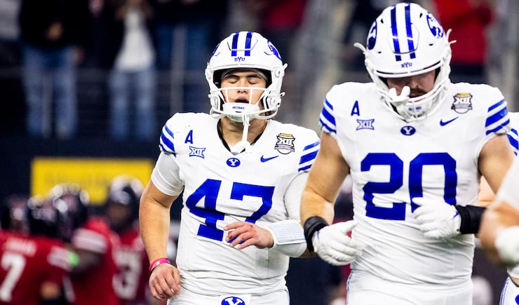BYU quarterback Bear Bachmeier (47) runs toward the sidelines after his pass was intercepted by a Texas Tech player in the third quarter of the Big 12 championship game at AT&T Stadium in Arlington, Texas, on Saturday, Dec. 6, 2025. | Isaac Hale, Deseret News