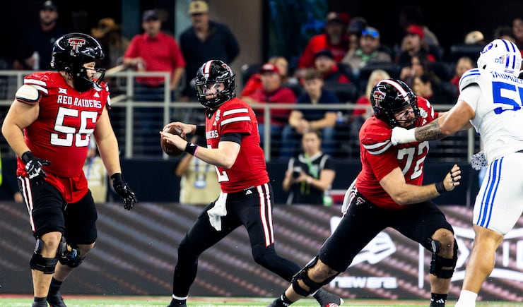 Texas Tech quarterback Behren Morton (2) winds up for a pass during the Big 12 championship game against BYU at AT&T Stadium in Arlington, Texas, on Saturday, Dec. 6, 2025. | Isaac Hale, Deseret News
