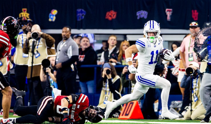 BYU wide receiver Parker Kingston (11) slips away from Texas Tech linebacker John Curry (6) as he runs the ball during the Big 12 championship game at AT&T Stadium in Arlington, Texas, on Saturday, Dec. 6, 2025. | Isaac Hale, Deseret News
