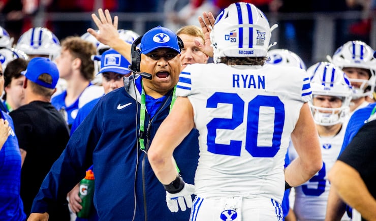 BYU head coach Kalani Sitake high-fives tight end Carsen Ryan (20) after a play during the Big 12 championship game against Texas Tech at AT&T Stadium in Arlington, Texas, on Saturday, Dec. 6, 2025. | Isaac Hale, Deseret News