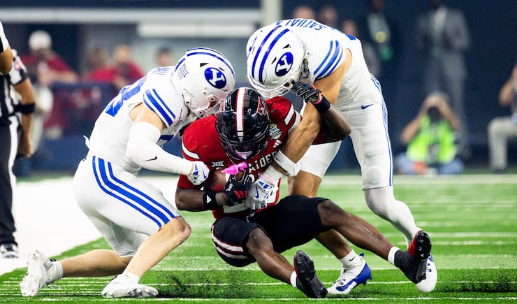BYU safeties Tanner Wall (28) and Faletau Satuala (11) down Texas Tech running back J’Koby Williams (20) during the Big 12 championship game at AT&T Stadium in Arlington, Texas, on Saturday, Dec. 6, 2025. | Isaac Hale, Deseret News