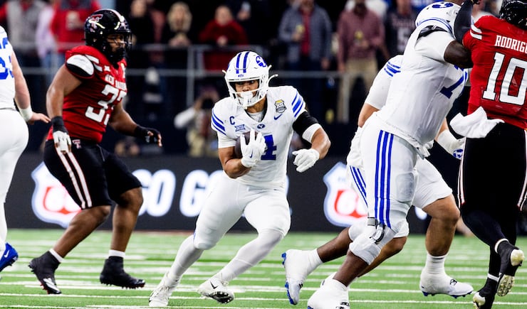BYU running back LJ Martin (4) runs the ball against the Texas Tech defense during the Big 12 championship game at AT&T Stadium in Arlington, Texas, on Saturday, Dec. 6, 2025. | Isaac Hale, Deseret News