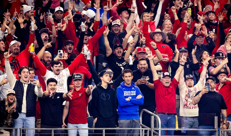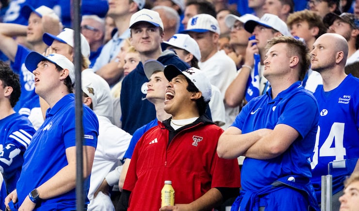 Texas Tech fans celebrate a touchdown surrounding two BYU fans during the Big 12 championship game at AT&T Stadium in Arlington, Texas, on Saturday, Dec. 6, 2025. | Isaac Hale, Deseret News