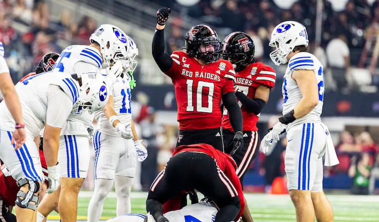 Texas Tech linebacker Jacob Rodriguez (10) celebrates after a play against BYU during the Big 12 championship game at AT&T Stadium in Arlington, Texas, on Saturday, Dec. 6, 2025. | Isaac Hale, Deseret News