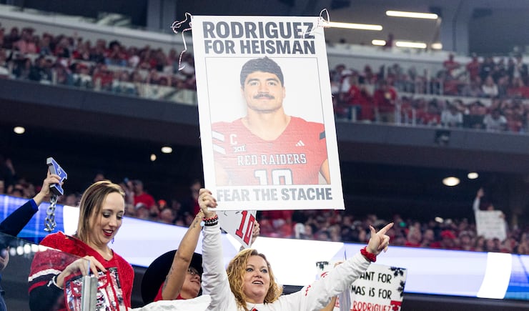 Texas Tech fans hold up a sign of linebacker Jacob Rodriguez (10) during the Big 12 championship game against BYU at AT&T Stadium in Arlington, Texas, on Saturday, Dec. 6, 2025. | Isaac Hale, Deseret News