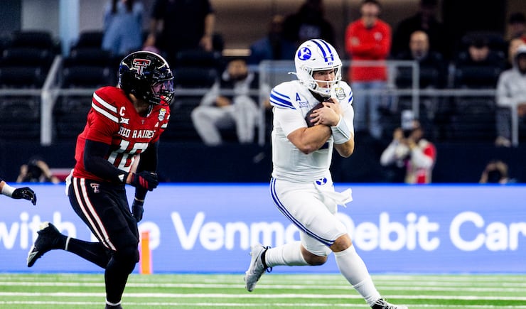 BYU quarterback Bear Bachmeier (47) runs with the ball as he’s pursued by Texas Tech Red linebacker Jacob Rodriguez (10) during the Big 12 championship game at AT&T Stadium in Arlington, Texas, on Saturday, Dec. 6, 2025. | Isaac Hale, Deseret News