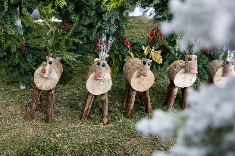 Little reindeers made from Christmas tree stumps and logs are also available for purchase aside from trees and greenery at the pop-up Christmas tree lot at Travis Park in downtown San Antonio. Credit: Amber Esparza / San Antonio Report