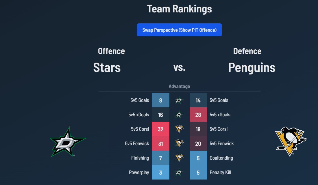 Injuries are starting to pile up for the Stars with Seguin and Bischel recently going on the IR. Team Canada’s Thomas Harley is in there too, opening the door for former Penguin Kolyachonok to get back in the lineup.In a lot of ways this Dallas lineup, structure and injury situation looks a lot like Pittsburgh’s previous opponent over in Tampa. The Stars, like the Lightning, have also both been really good in the last 10, 12 games, despite some their adversity and fairly patchwork-looking lower part of the lineup. Some of the formula is the same, if you have enough firepower on the top two lines and a really good goalie, that’s enough to get momentum going for a quality team to get in a groove. Of course, Dallas has their most key defender (Heiskanen), a luxury the Lightning don’t have these days.