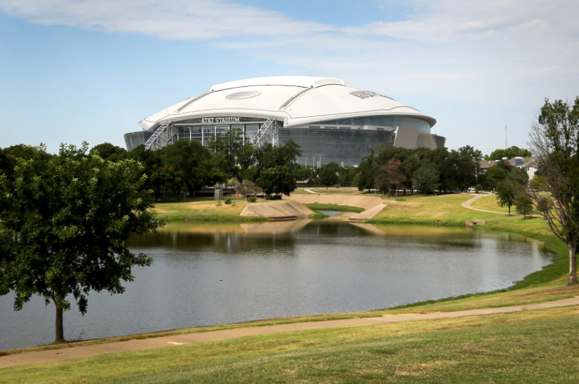AT&T Stadium, home of the Dallas Cowboys, seen from the Richard Greene Linear Park in Arlington. The stadium will be temporarily dubbed Dallas Stadium for the FIFA World Cup. (Yfat Yossifor | KERA News)