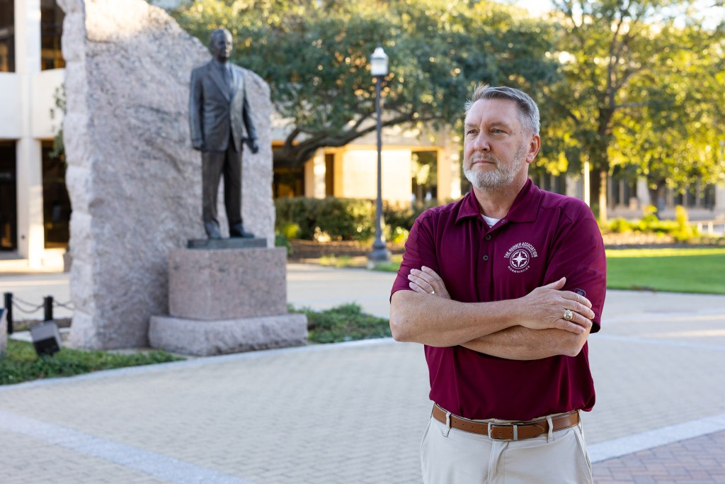 Matt Poling, president of The Rudder Association, poses for a portrait next to the statue of former Texas A&M President James Earl Rudder on the Texas A&M University campus in College Station on Oct. 30, 2025. Cassie Stricker for The Texas Tribune