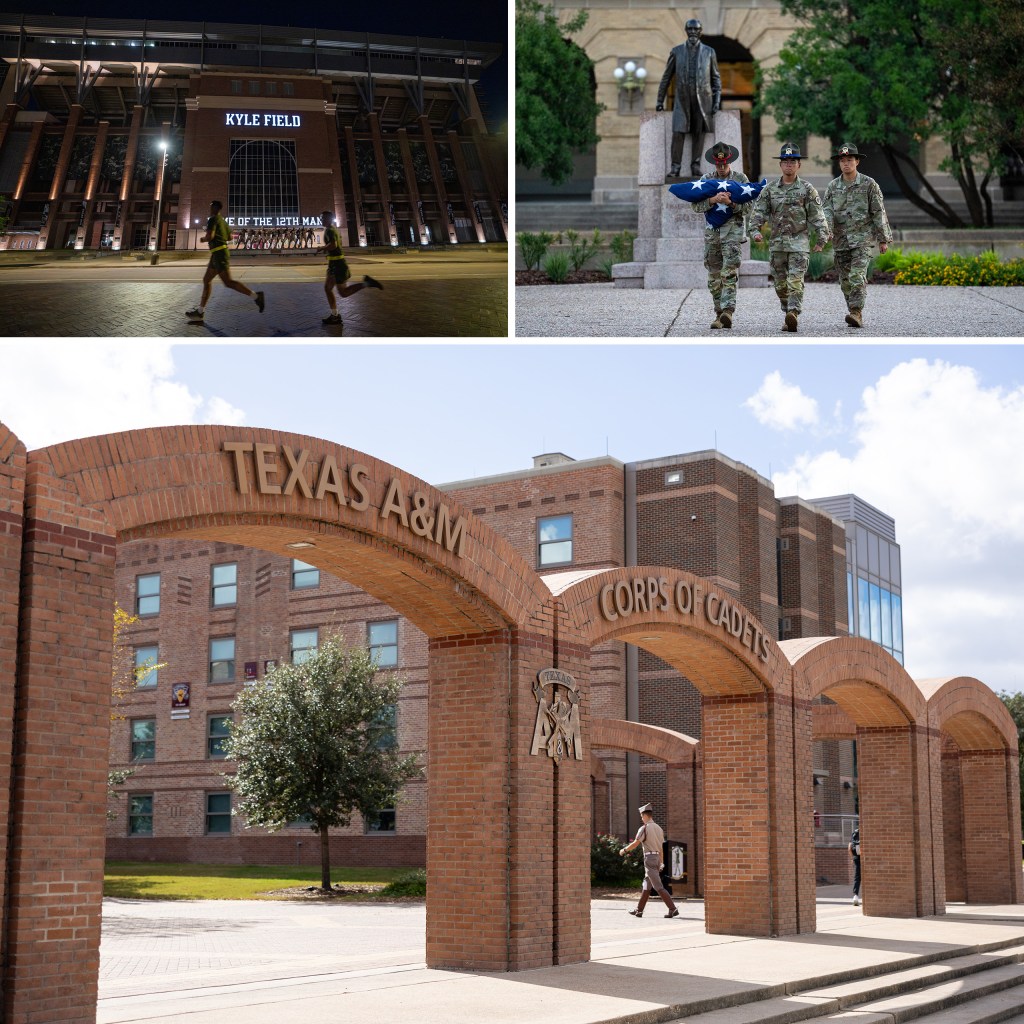 Clockwise from top left: Members of the Texas A&M Corps of Cadets run past Kyle Field in College Station on Nov. 25, 2025. Later, cadets walk an American flag to the flagpole in Academic Plaza. The Corps Arches mark the entrance to the Corps Quad, where most cadets live. Courtney Sacco and Cassie Stricker for The Texas Tribune